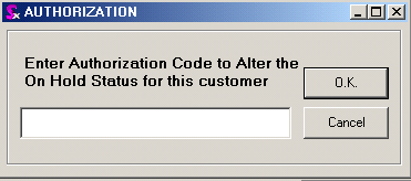 As an option, you can place a customer On Hold with the restriction that an authorization code must be entered to change their On Hold status. If this restriction is activated, the message appears as below.